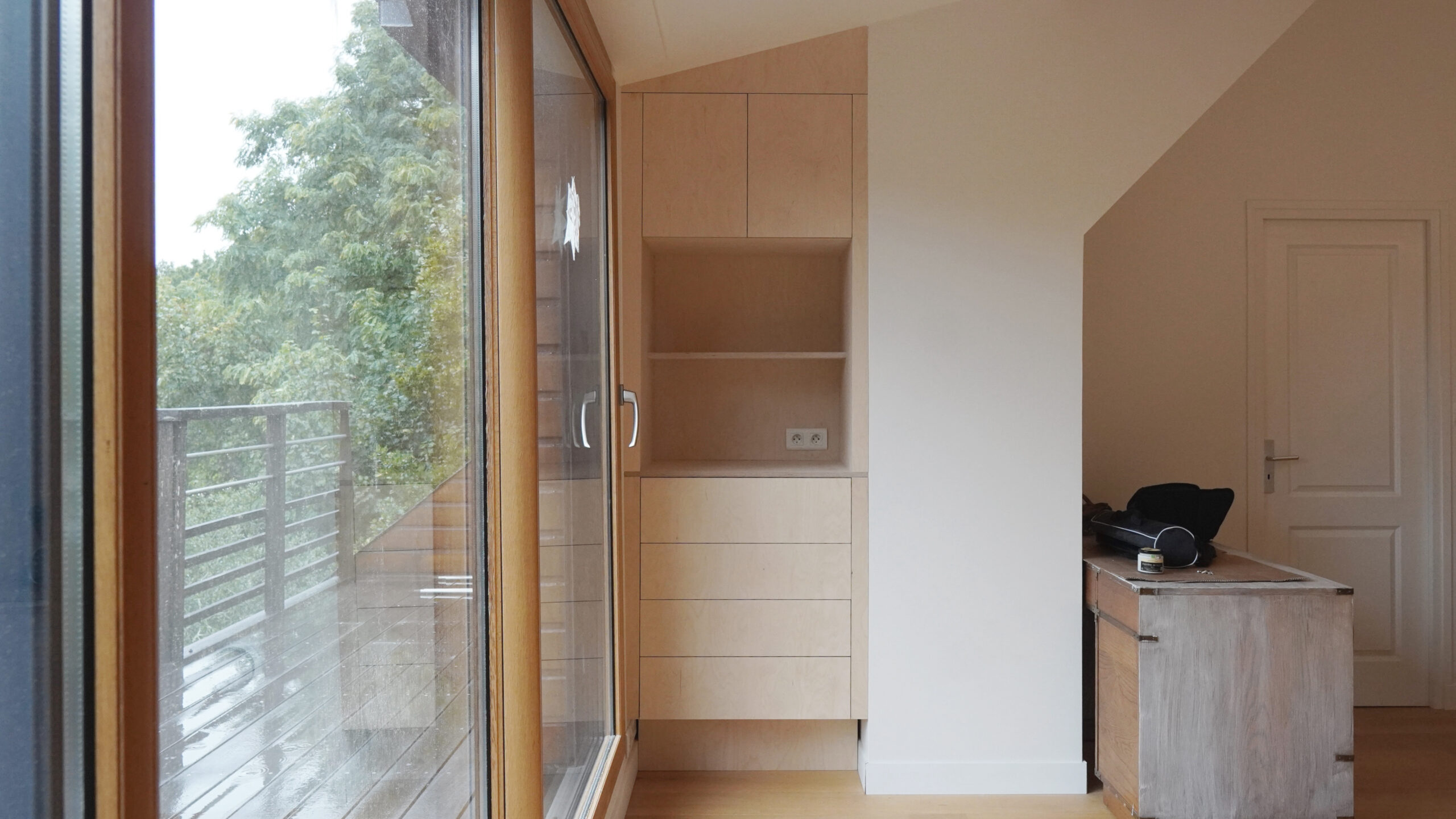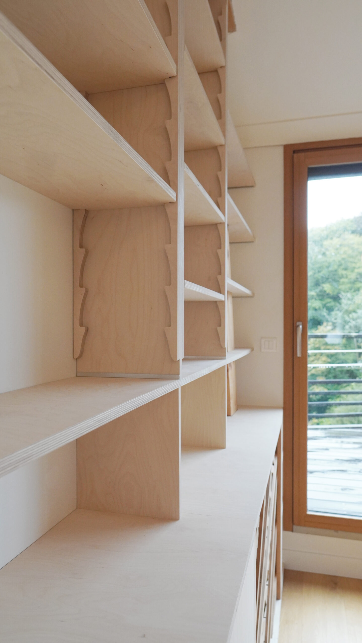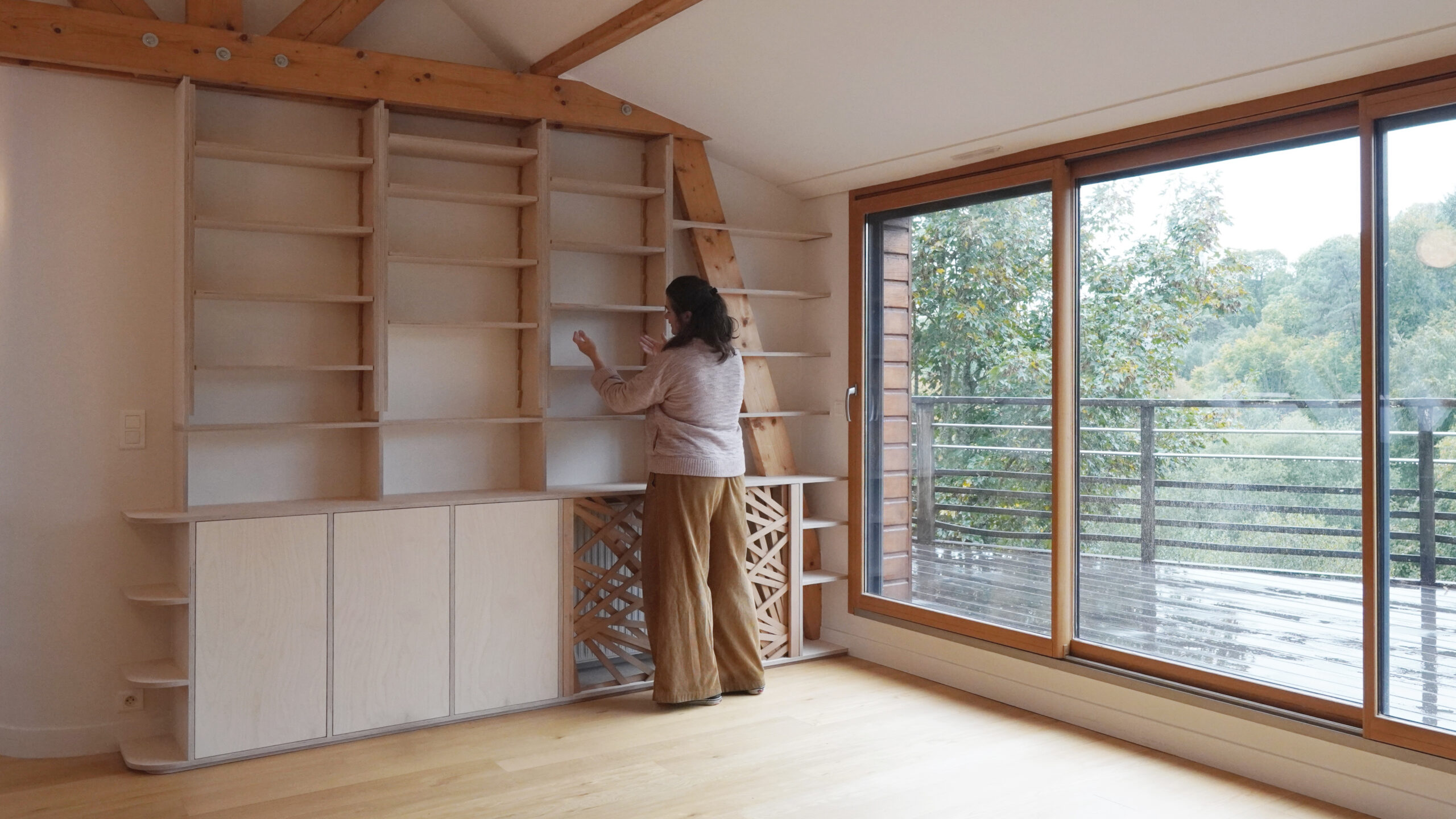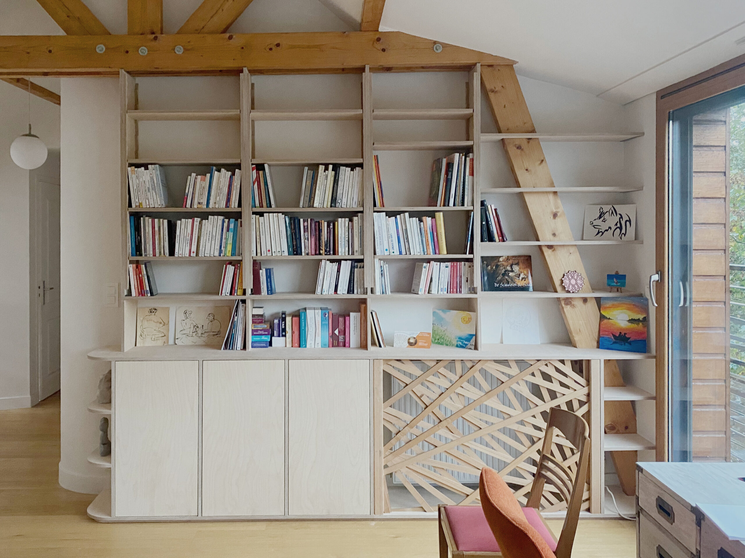 Venir habiter une pièce délaissée et meublée de meubles éparses. Pour retrouver une homogénéité, le projet consiste à intégrer une bibliothèque et un rangement pour des activités créatives. L’ensemble a été réalisé en contreplaqué de bouleau. Les crémaillières ont été dessinées et réalisées à la CNC en chène.