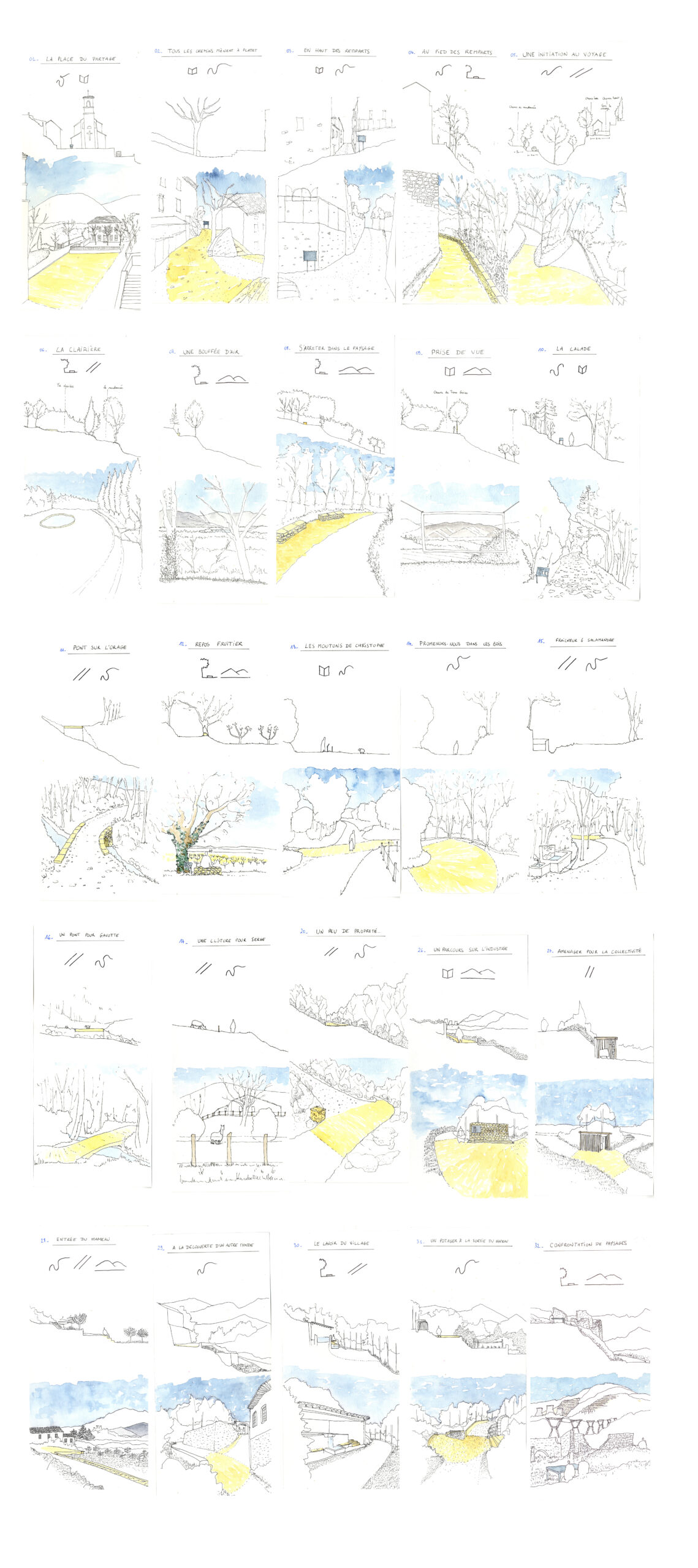 Après un arpentage du site, nous proposons 32 interventions, regroupées en cinq typologies : la contemplation, l’infrastructure, la promenade, le repos et enfin le savoir-faire. Partant d’un état des lieux sensible (carte sensible) à des propositions architecturales et paysagères, nous cherchons à révéler une promenade mais aussi à requalifier un hameau qui a toujours eu une vocation artisanale.