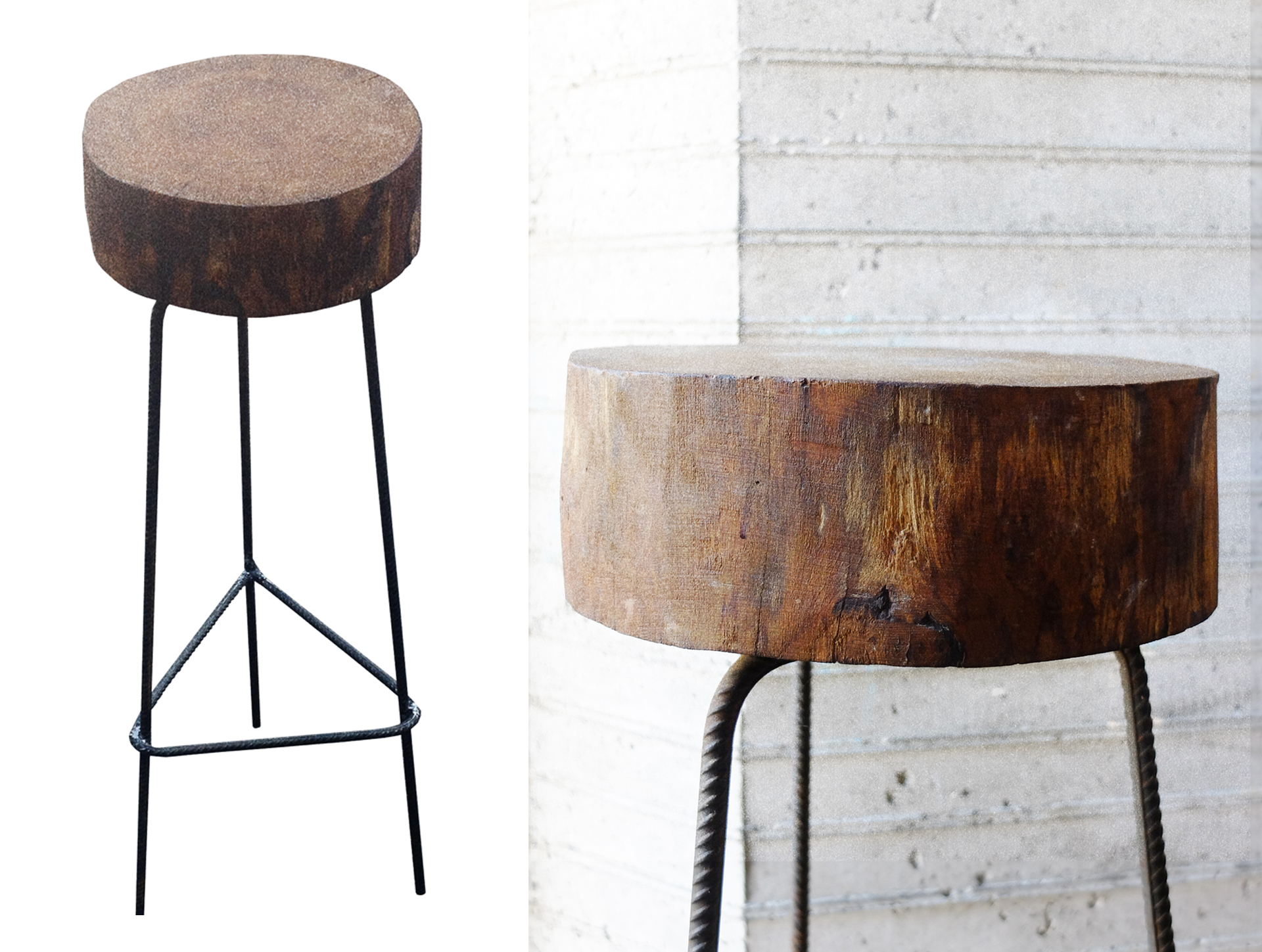 S’asseoir sur un tronc d’arbre, retrouver un peu de nature. S’élever sur des tiges de fer, profiter de l’industrie. Le léger peut alors supporter le lourd, reposant le plus simplement sur ses trois appuis, pas un de plus, pas un de moins!